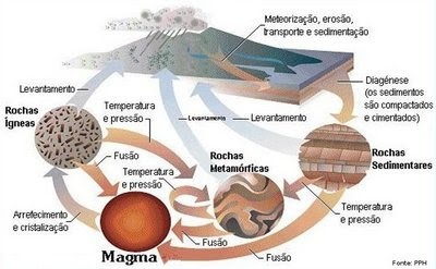 “Numa Terra dinâmica as rochas representam por isso sempre situações efémeras, pois resultam da transformação de rochas pré-existentes e inevitavelmente irão dar origem à formação de novas rochas, pelo menos enquanto o arrefecimento do nosso planeta não atingir valores que impeçam a Tectónica de Placas. Este ciclo de contínuas transformações é denominado Ciclo das Rochas, o qual só é possível devido à permanente atuação de um conjunto de processos. Meteorização, erosão, transporte, deposição e diagénese (3) são processos profundamente ligados ao ciclo hidrológico enquanto a recristalização e a fusão seguida de cristalização são fundamentalmente condicionados pelo ciclo tectónico”. (4)